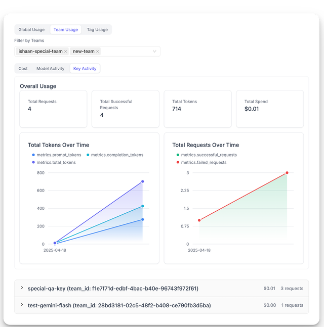 • Team and Tag based usage tracking: You can now see usage and spend by team and tag at 1M+ spend logs.